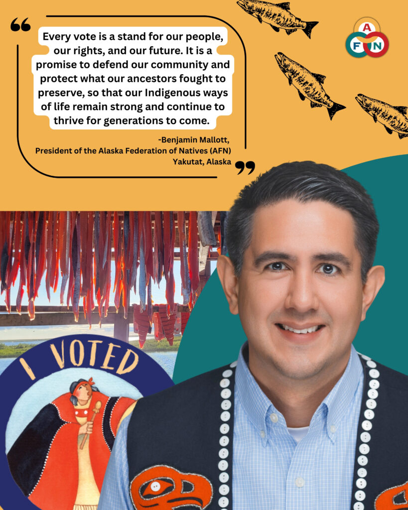 The Native Vote Initiative partnership includes the Alaska Federation of Natives (AFN), Get Out the Native Vote (GOTNV), Alaska Regional Association (ARA), Interior Native Votes, Southcentral Foundation (SCF), Alaska Native Tribal Health Consortium (ANTHC), First Alaskans Institute (FAI), Cook Inlet Tribal Council (CITC), Native Movement (NM), Native Peoples Action Community Fund (NPACF), Rural Indigenous Outreach Team (RIO), Koniag, Tlingit & Haida Central Council (T&H), Sealaska, YK GOTNV Coalition, Calista, United Tribes of Bristol Bay (UTBB), and more continue to join this collaborative effort..
